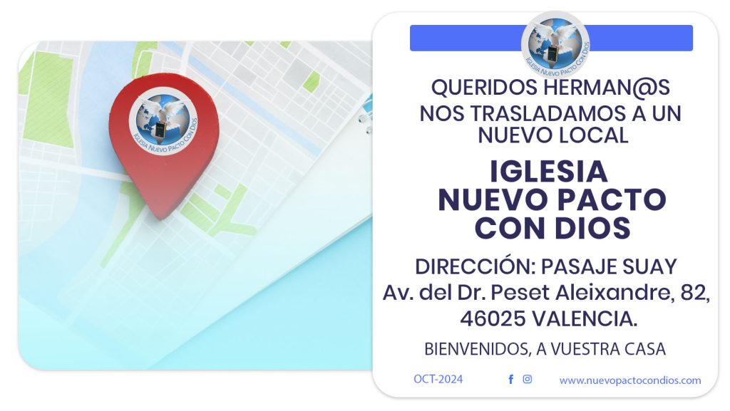 Nos hemos trasladado a la nueva dirección de nuestra iglesia en Av. del Dr. Peset Aleixandre, 82, en el Pasaje Suay, 46025 Valencia.